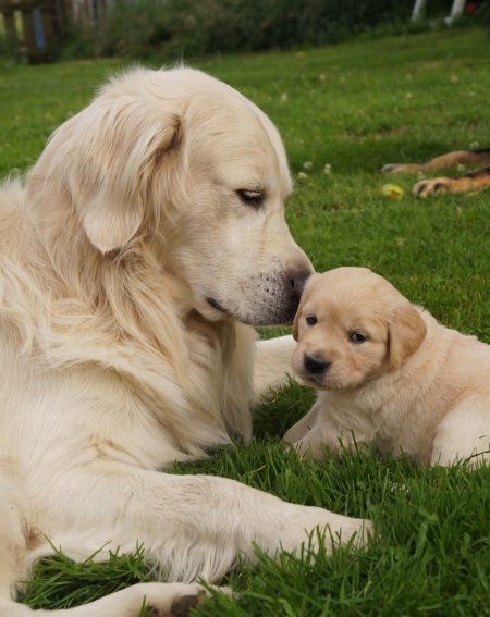Mit vier Wochen nehmen die Welpen jetzt zunehmend ihre Umwelt wahr - Zeit, ihren Vater kennenzulernen.